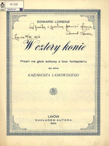 Na stronie tytułowej widnieje dedykacja: Z prośbą o życzliwą pamięć ofiaruje Edward Lorenz. Krynica, 21 VII 1926 i kolejna nad nagłówkiem Pani Zofii Rogalskiej.