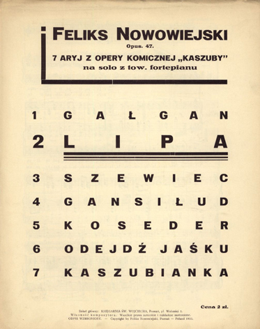7 arii z opery komicznej „Kaszuby”: solo z towarzyszeniem fortepianu: opus 47 Tytuł oryginalny: 7 aryj z opery komicznej „Kaszuby”: solo z towarzyszeniem fortepianu: opus 47. 2: Lipa Nowowiejski, Feliks (muzyka) Oznaczenie autora wg wydawcy: Nowowiejski Feliks Obsada instrumentalna: Solo z towarzyszeniem fortepianu. |