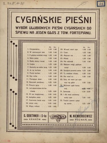 Cygańskie Pieśni: wybór ulubionych pieśni cygańskich do śpiewu na jeden głos z towarzyszeniem fortepianu, 30 |