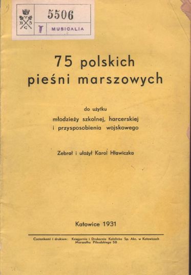 75 pieśni marszowych: do użytku młodzieży szkolnej, harcerskiej i przysposobienia wojskowego Hławiczka, Karol (zebrał, układ) Oznaczenie autora wg wydawcy: Hławiczka Karol |