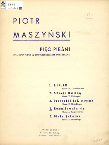 Piosenka wchodzi w skład zbioru pt. Pięć pieśni : na jeden głos z towarzyszeniem fortepianu. Brak informacji o dacie wydania publikacji.