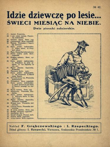 Idzie dziewczę po lesie... ; Świeci miesiąc na niebie: dwie piosenki żołnierskie Szlendak, Adam (układ) Oznaczenie autora wg wydawcy: Szlendak Adam Obsada instrumentalna: Na fortepian z tekstem podłożonym. |