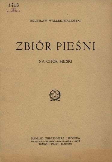 Zbiór pieśni: na chór męski Wallek-Walewski, Bolesław (opracowanie) Obsada instrumentalna: Na chór męski. |