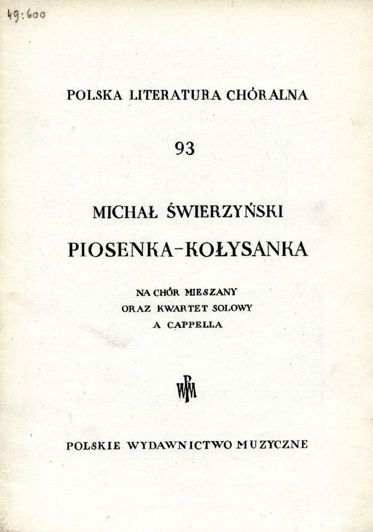 Piosenka-kołysanka: na chór mieszany oraz kwartet solowy a cappella Świerzyński, Michał (muzyka) Oznaczenie autora wg wydawcy: Świerzyński Michał Obsada instrumentalna: Na chór mieszany oraz kwartet solowy a cappella. |