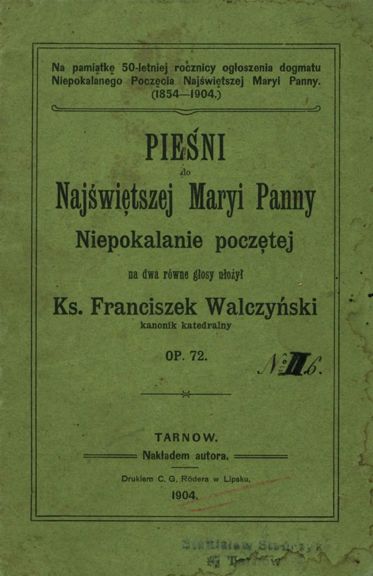 Pieśni do Najświętszej Maryi Panny Niepokalanie poczętej: op. 72 Walczyński, Franciszek (układ) Oznaczenie autora wg wydawcy: Walczyński Franciszek Uzupełnienie: na dwa równe chóry ułożył Franciszek Walczyński Obsada instrumentalna: Na dwa równe chóry. |