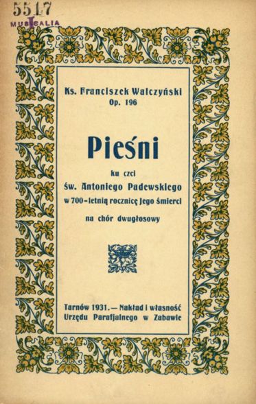 Pieśni ku czci św. Antoniego Padewskiego w 700-letnią rocznicę jego śmierci: na chór dwugłosowy: op. 196 Walczyński, Franciszek (muzyka) Oznaczenie autora wg wydawcy: Walczyński Franciszek Obsada instrumentalna: Na chór dwugłosowy. |