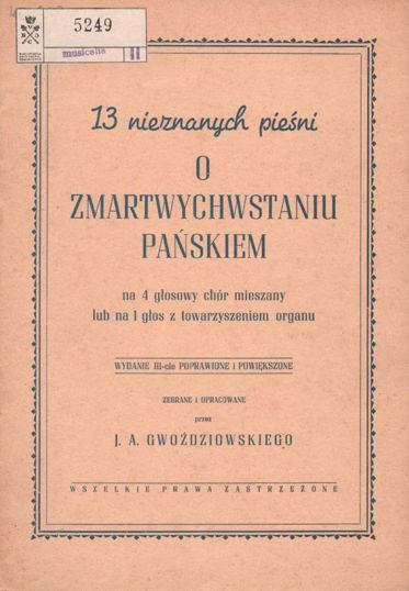 13 nieznanych pieśni o Zmartwychwstaniu Pańskim: na 4-głosowy chór mieszany lub na 1 głos z towarzyszeniem organu Tytuł oryginalny: 13 nieznanych pieśni o Zmartwychwstaniu Pańskiem: na 4-głosowy chór mieszany lub na 1 głos z towarzyszeniem organu Gwoździowski, Józef Albin (zebrał, opracowanie) Oznaczenie autora wg wydawcy: Gwoździowski Józef Albin Obsada instrumentalna: Na 4-głosowy chór mieszany lub na 1 głos z towarzyszeniem organu. |