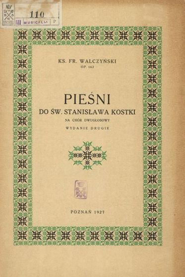 | Tytuł: | Pieśni do św. Stanisława Kostki: na chór dwugłosowy Walczyński, Franciszek (muzyka) Oznaczenie autora wg wydawcy: Walczyński Franciszek Obsada instrumentalna: Na chór dwugłosowy. |